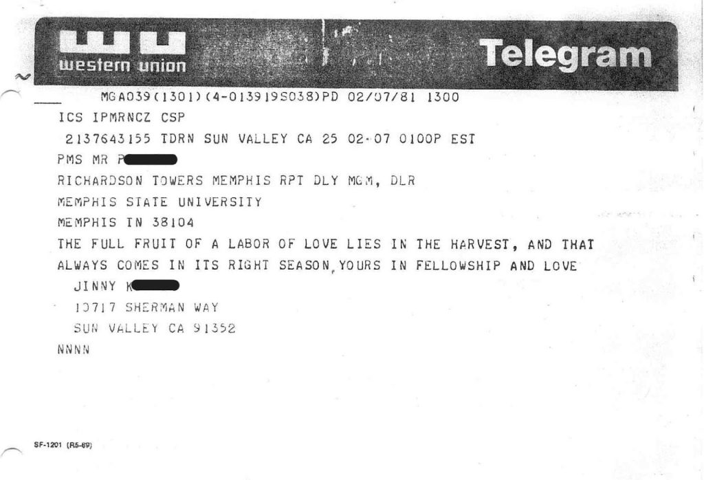 - Bo S. (1981). Letter to fellow members regarding Memphis Literature Conference, April 1981. ↩︎